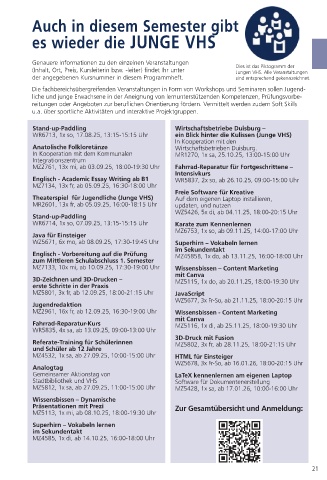(Inhalt, Ort, Preis, Kursleiterin bzw. -leiter) findet Ihr unter Jungen VHS. Alle Veranstaltungen