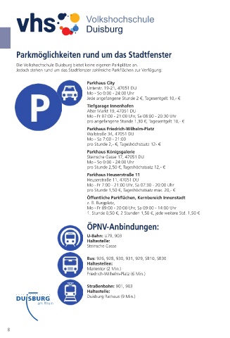 Die Volkshochschule Duisburg bietet keine eigenen Parkplätze an.